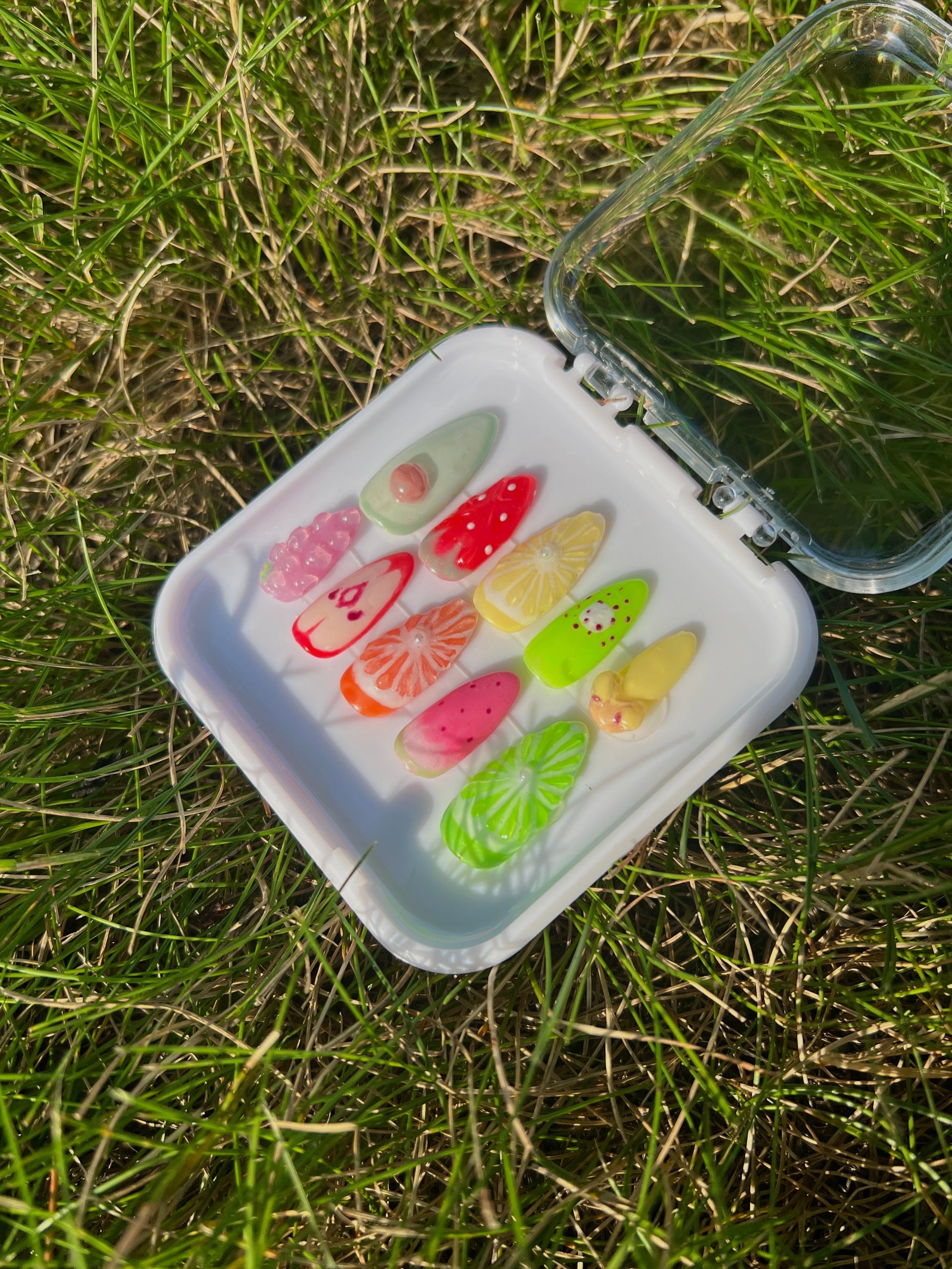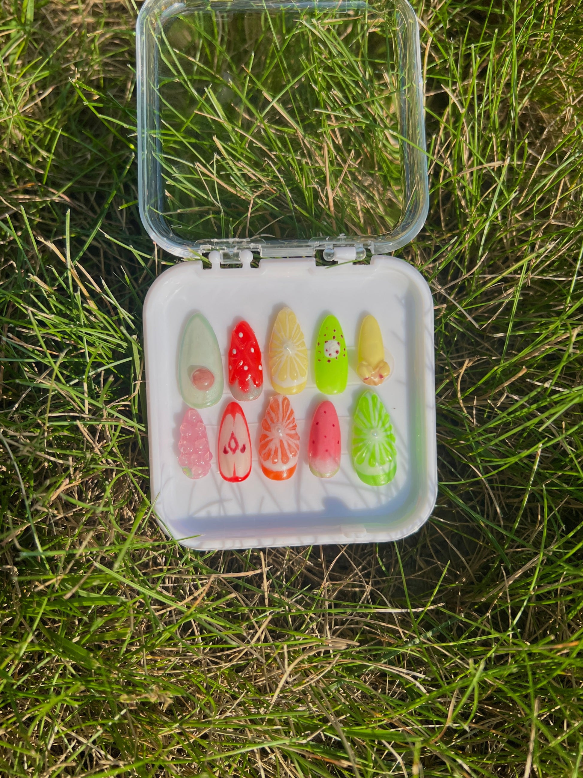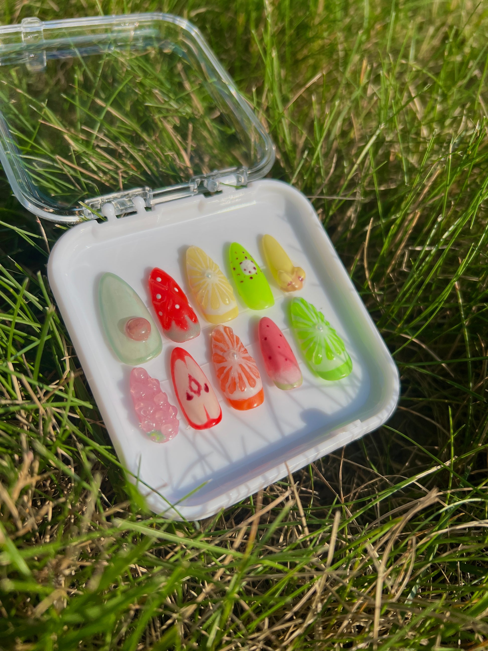 These nails are perfect for summer! Each press-on features different fruits, so your fingertips can look unique and ready for summer! With hand crafted 3D designs on each hand, you will be sure to stand out. These can be customized by length and shape to fit your vibe.