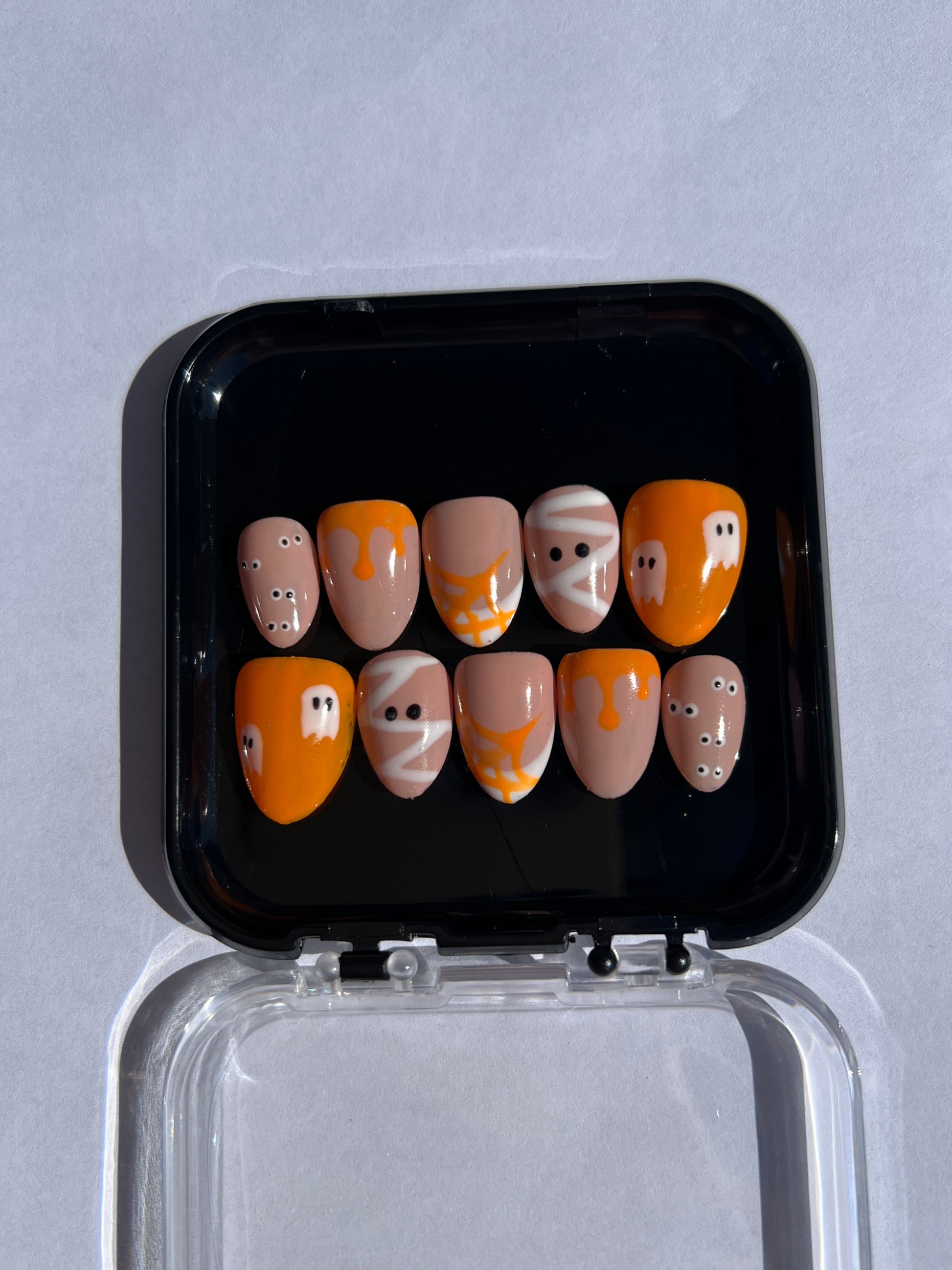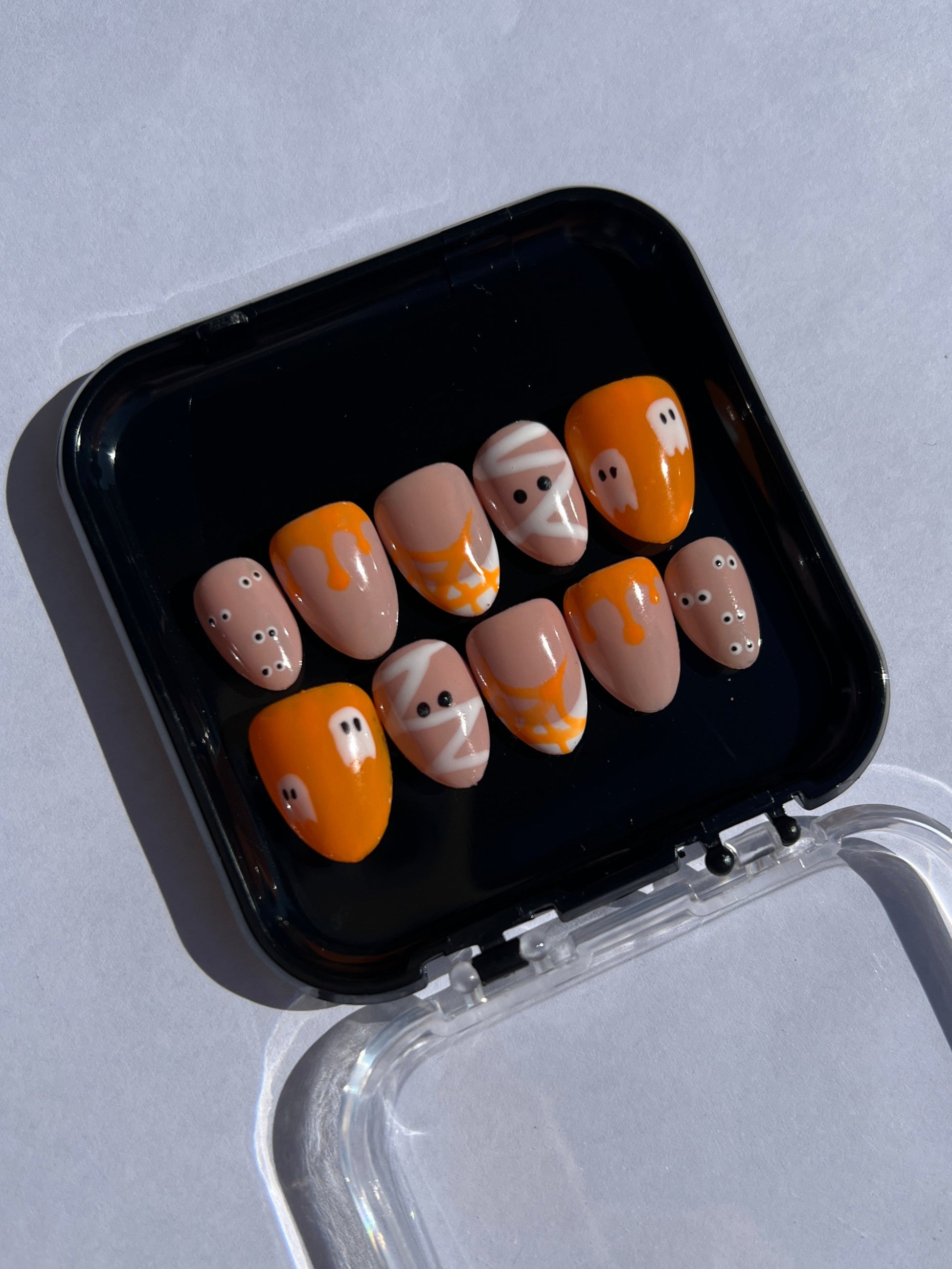 These hand painted nails feature a different design on each nail! With ghosts, spiderwebs, and mummies, it's sure to get you in the spooky spirit! These can be customized by length and shape.Â
