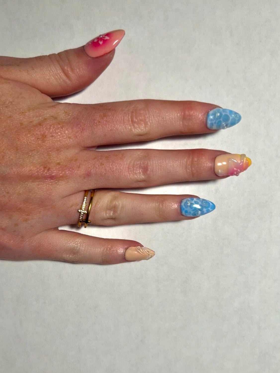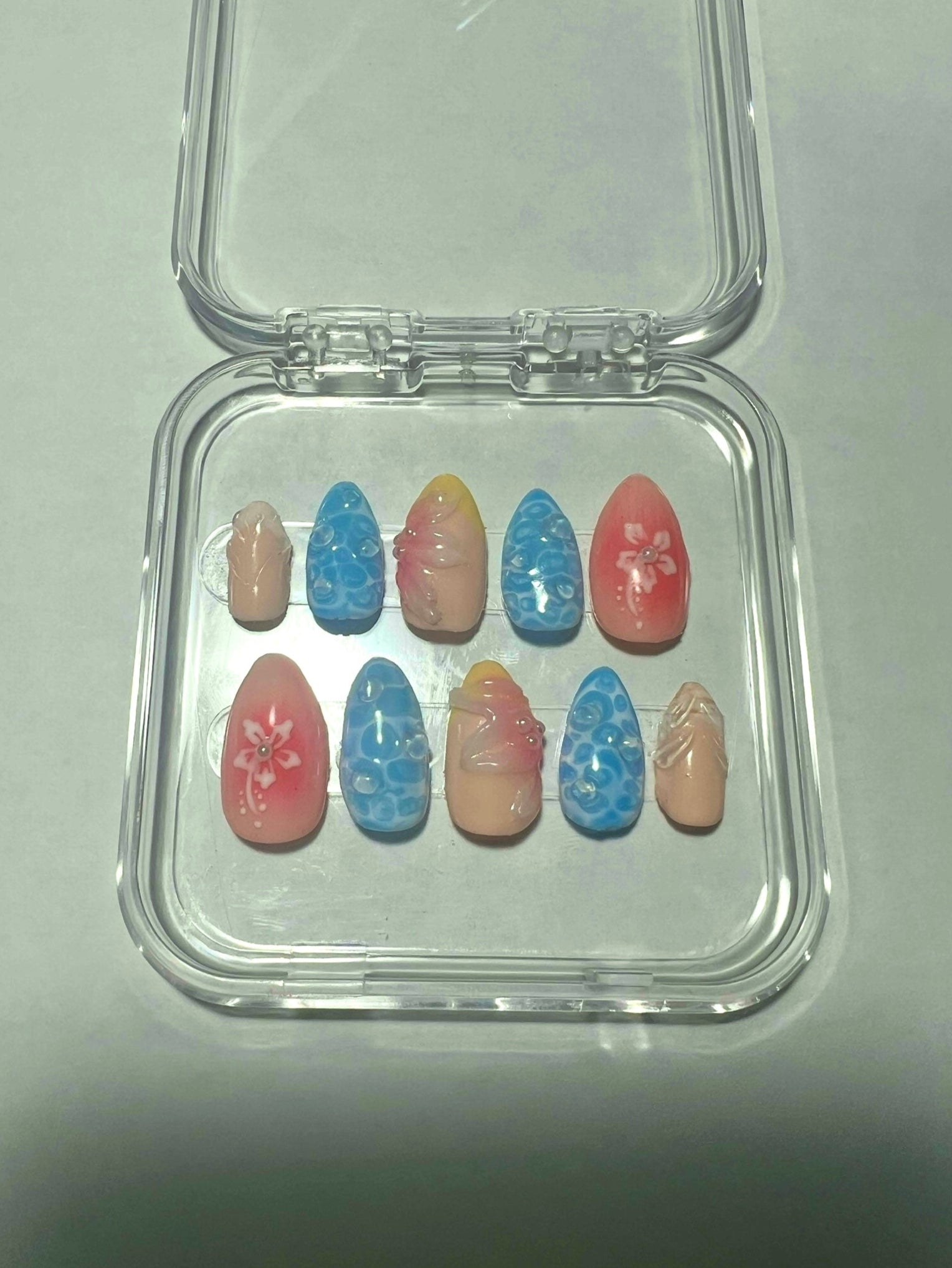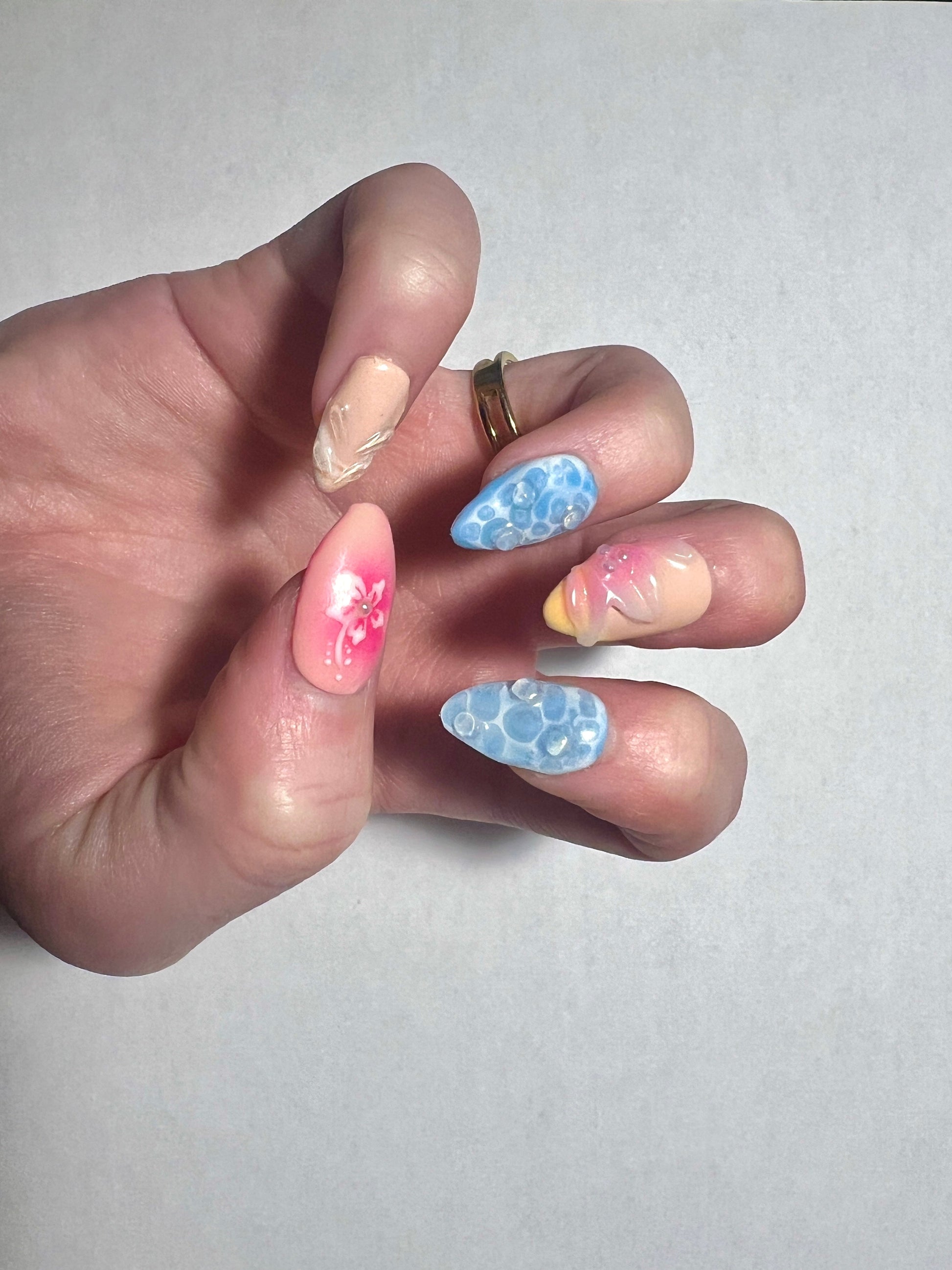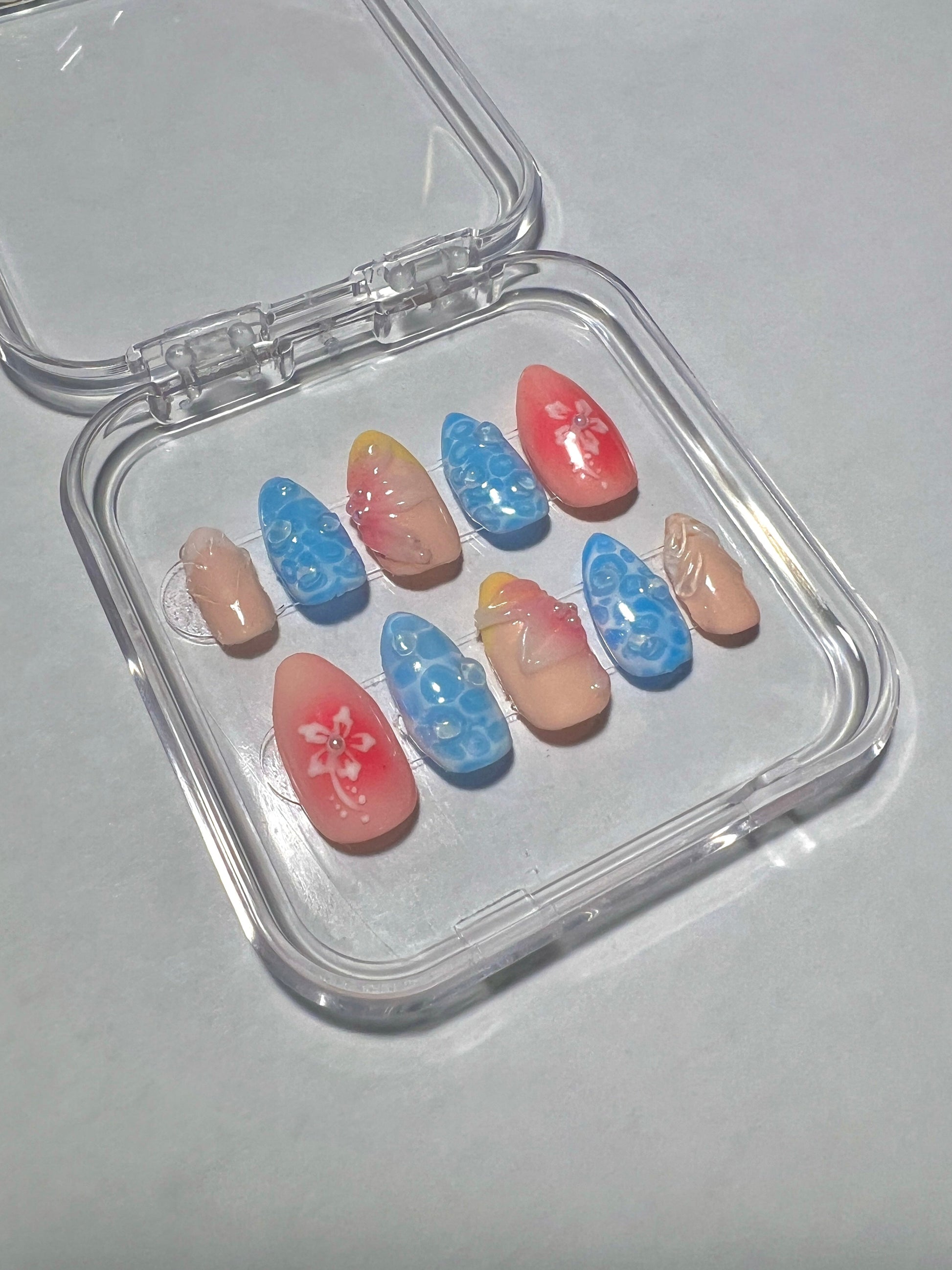 If you are a beach lover, these nails are for you! With 3D water and flower designs, it looks like summer right on your fingertips. These can be customized by shape and length to fit your summer vibe!