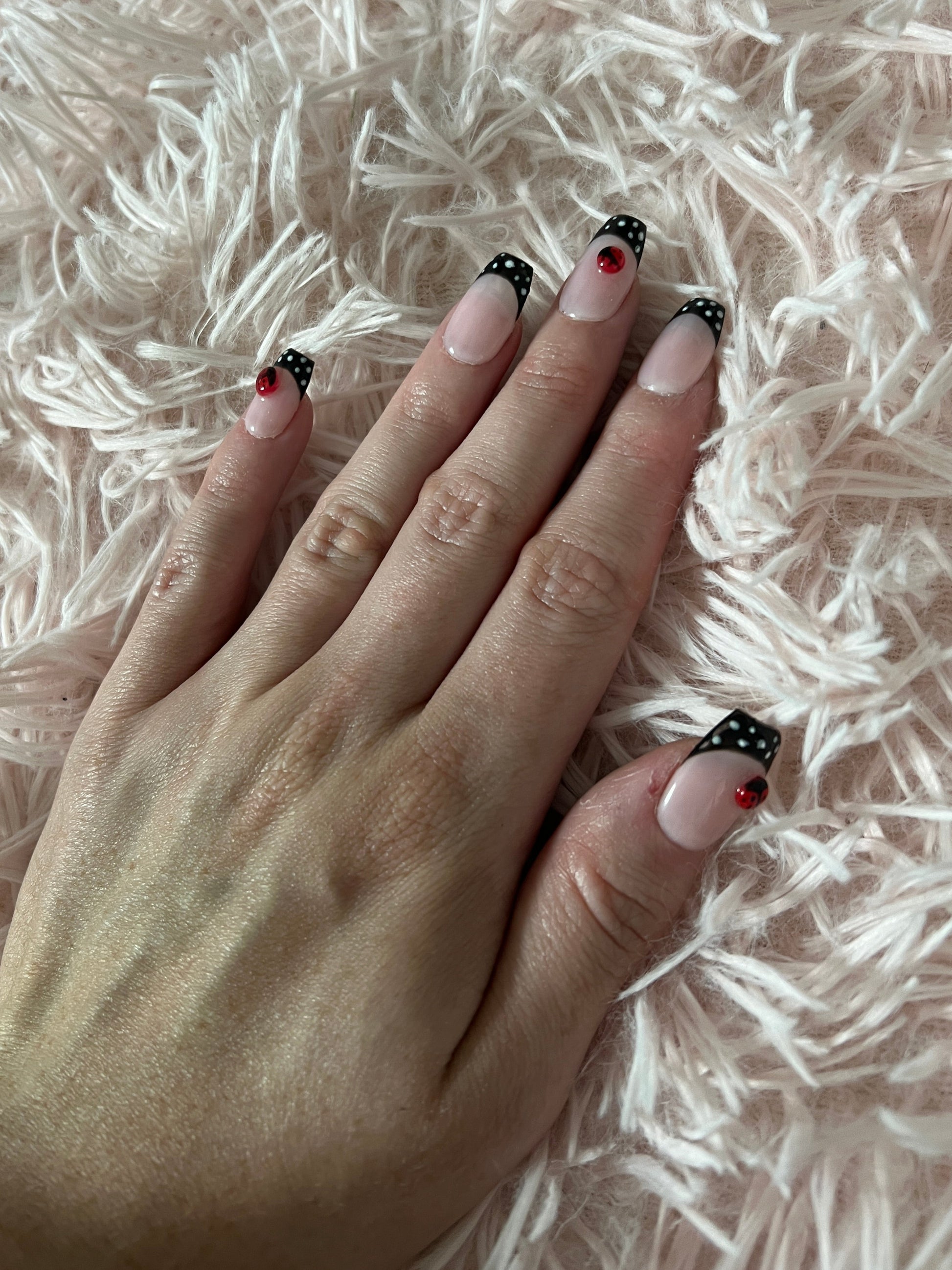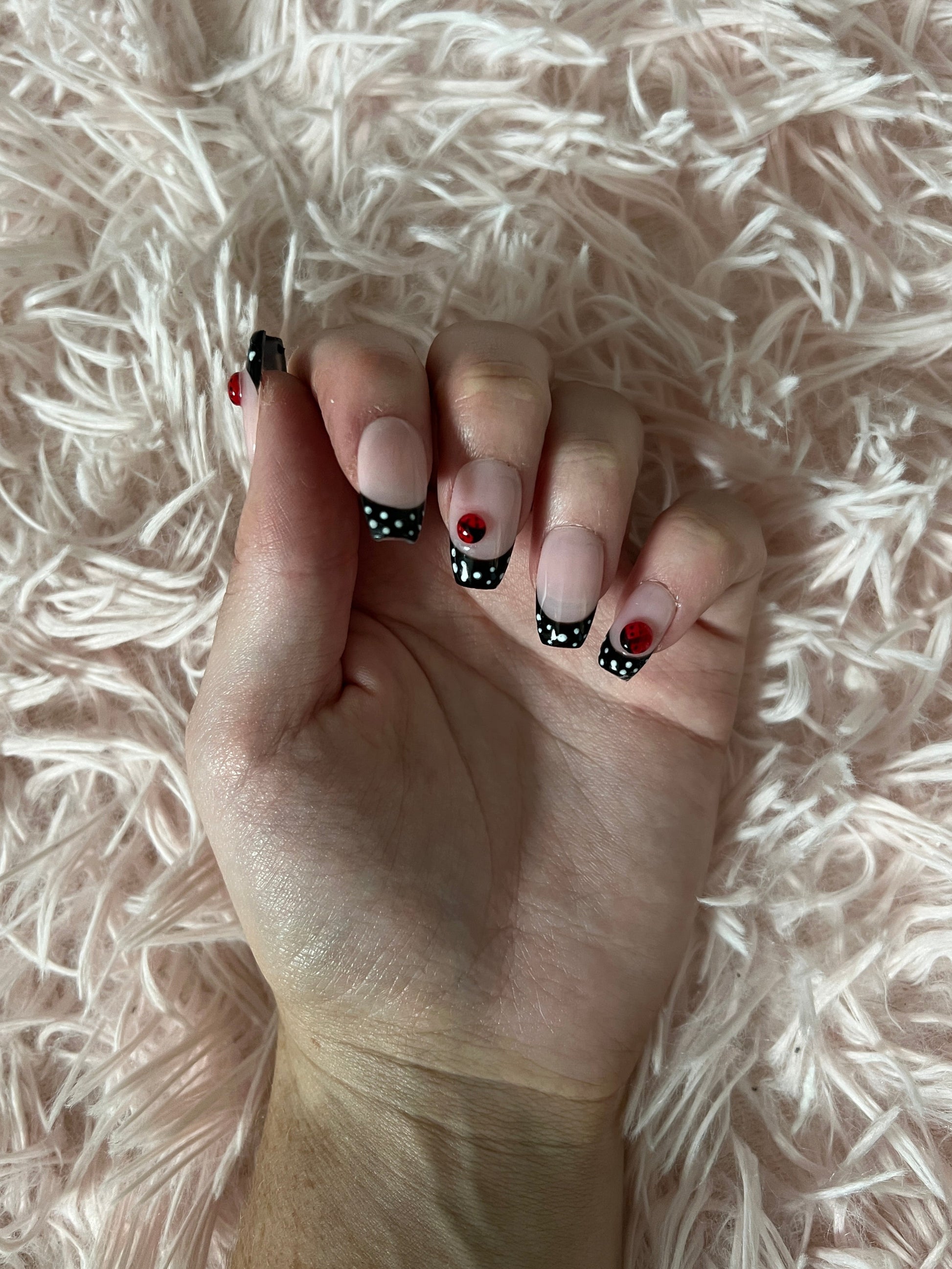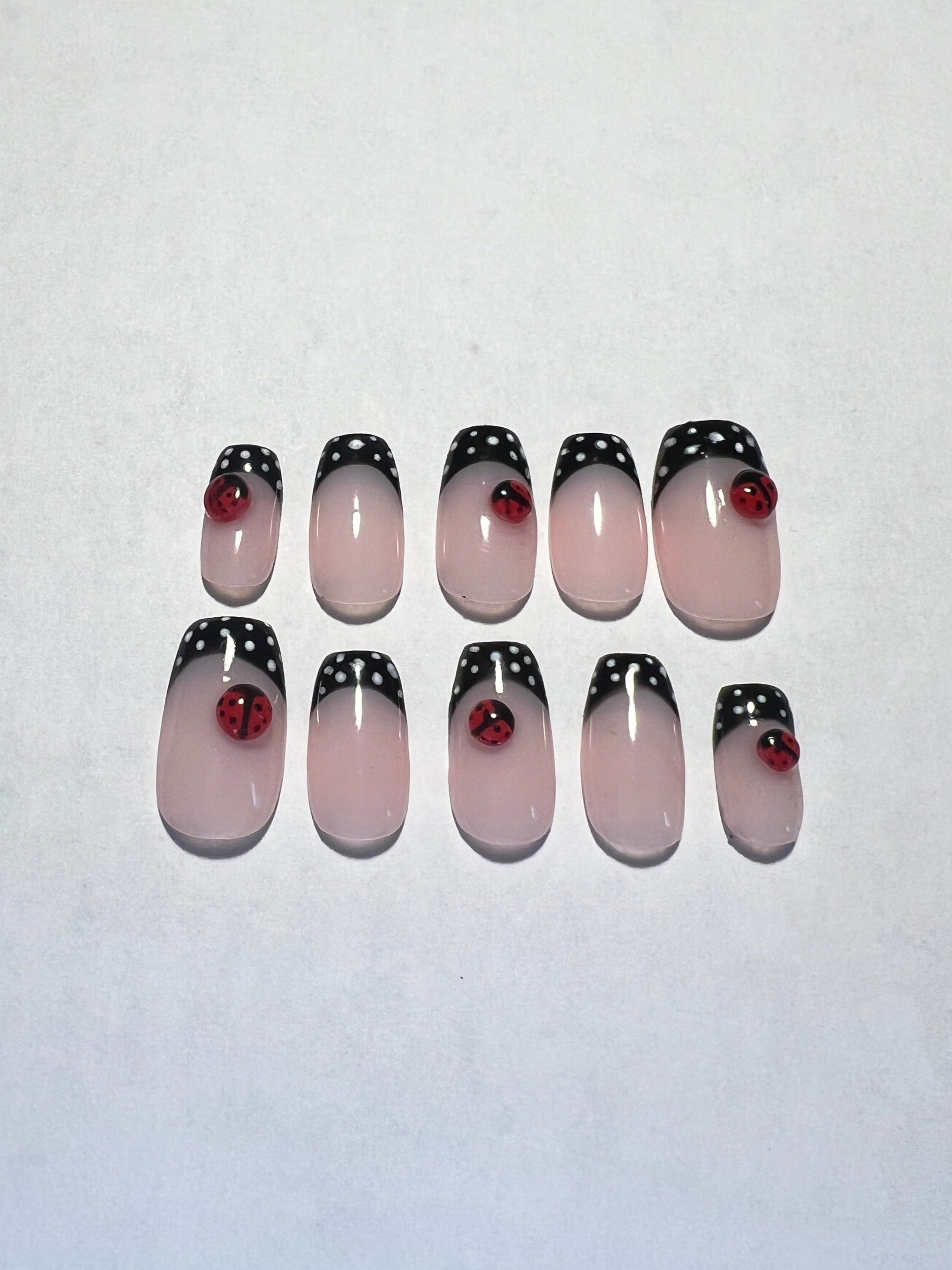These hand painted nails feature a black french tip, with white polka dots, and cute ladybugs on the tips! These can be customized by length, and shape to fit your picnic vibe!