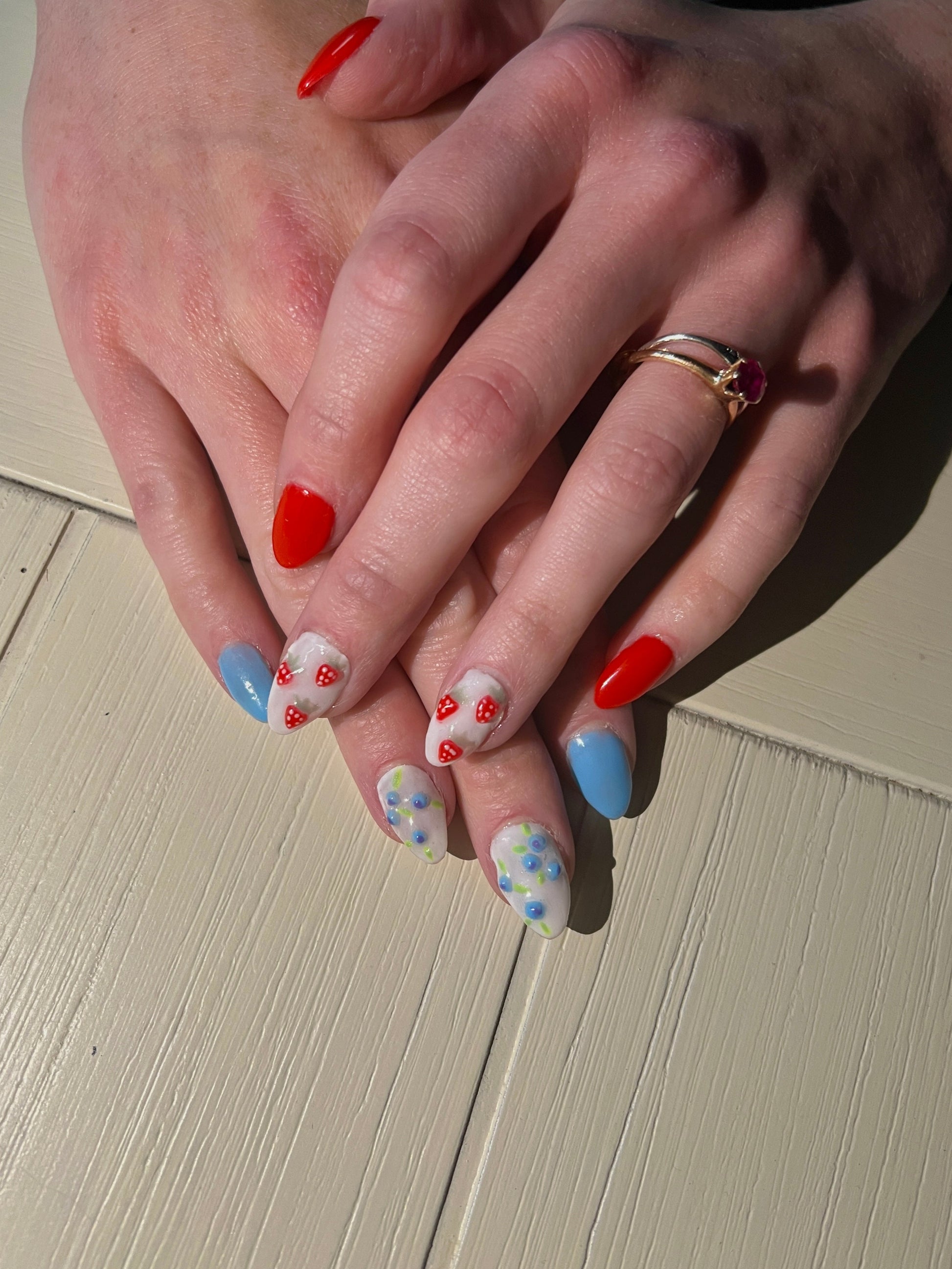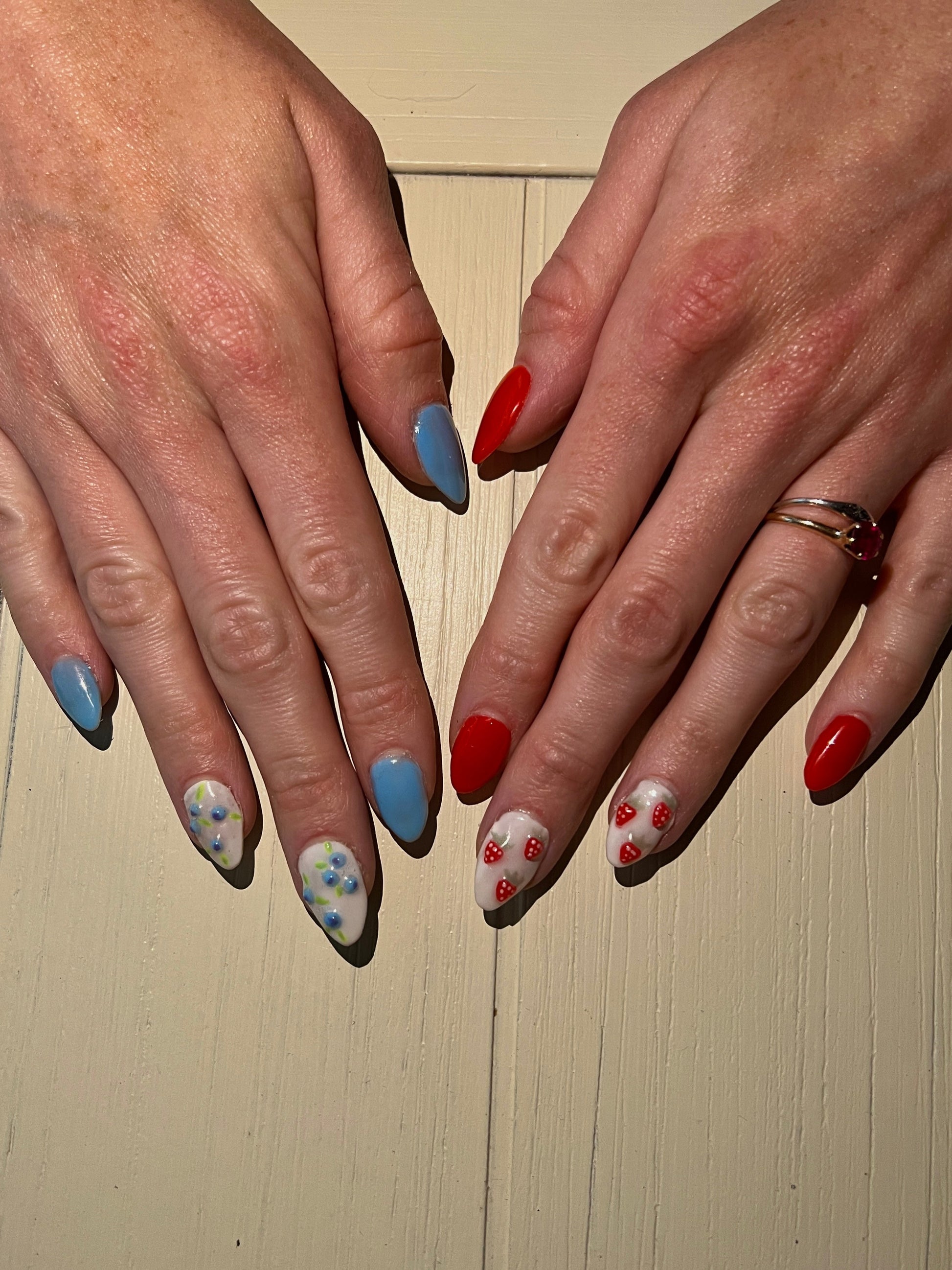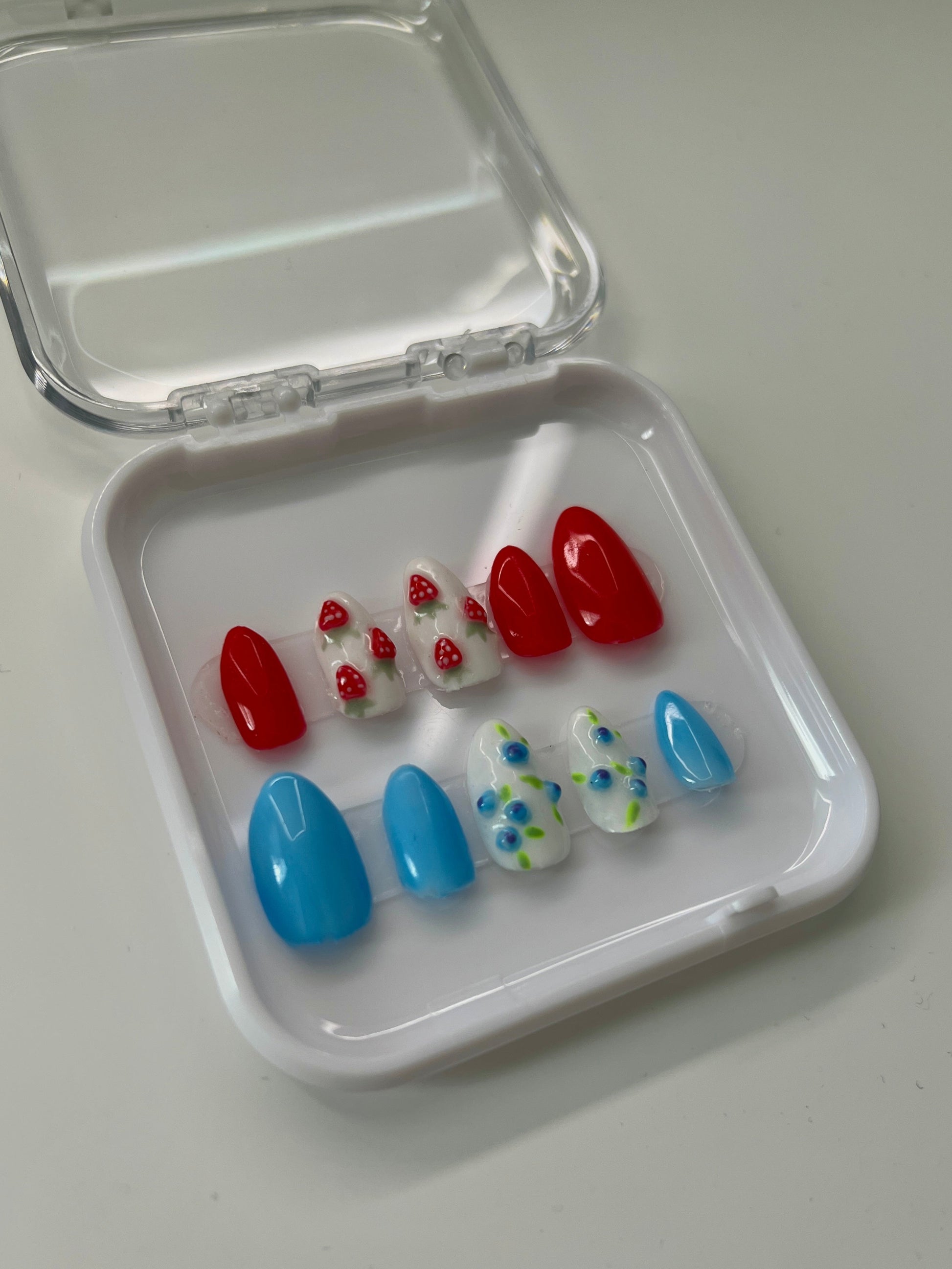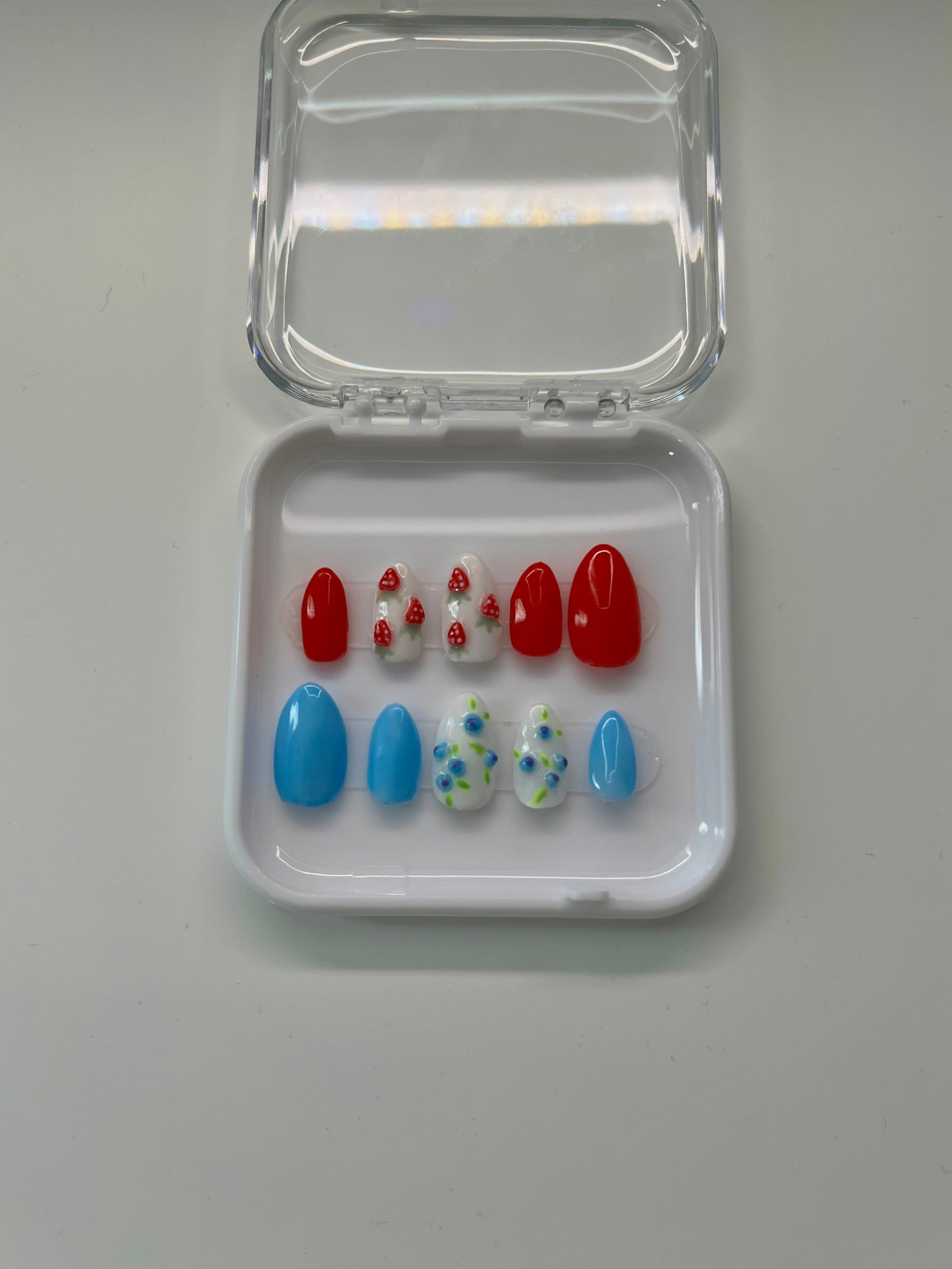 These 3D hand crafted blueberries and strawberries are sure to make you shine! With the red, white, and blue accents, these are perfect for the fourth of July- or even just for fun! These can be customized by shape and length to fit your unique vibe.